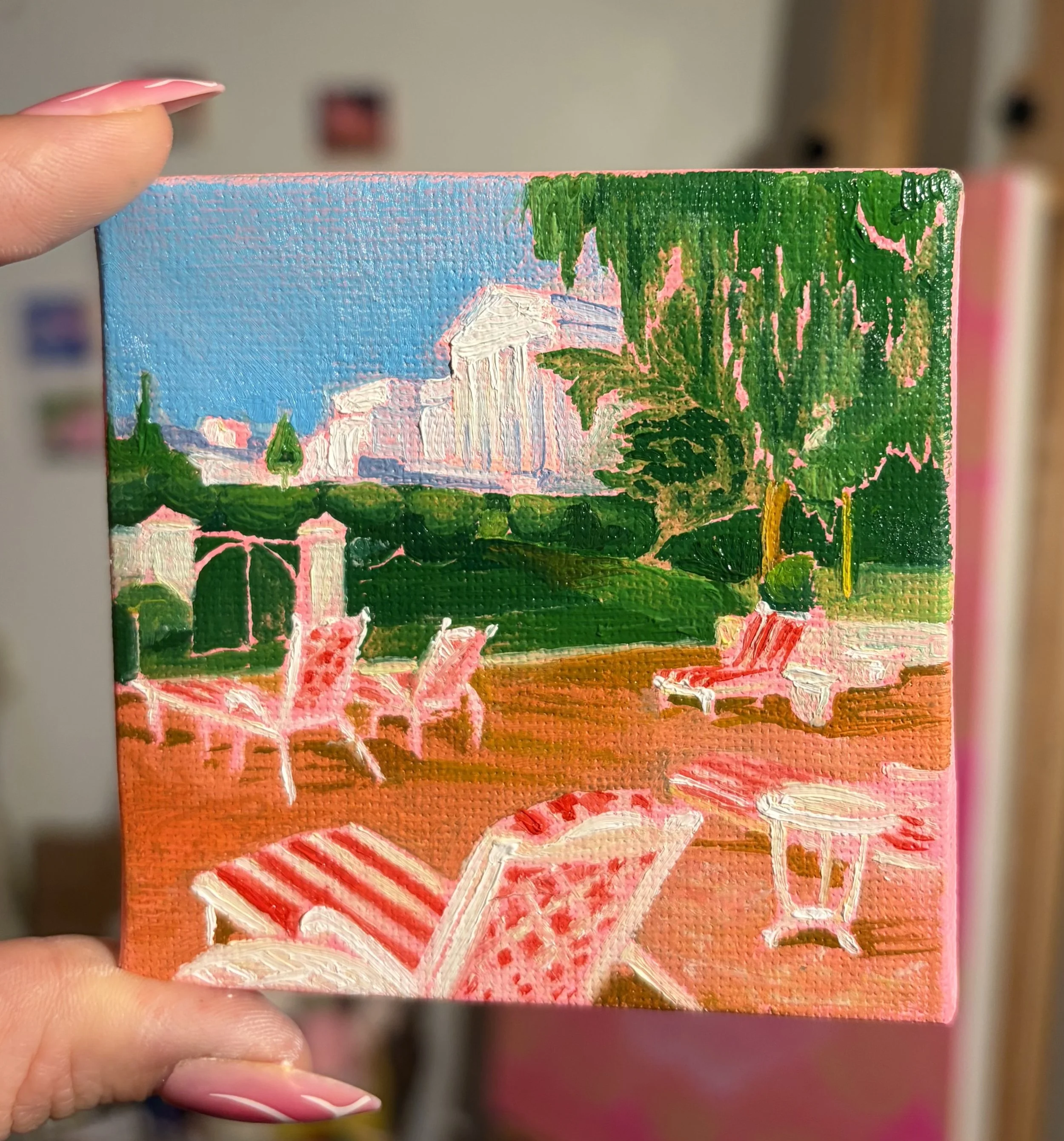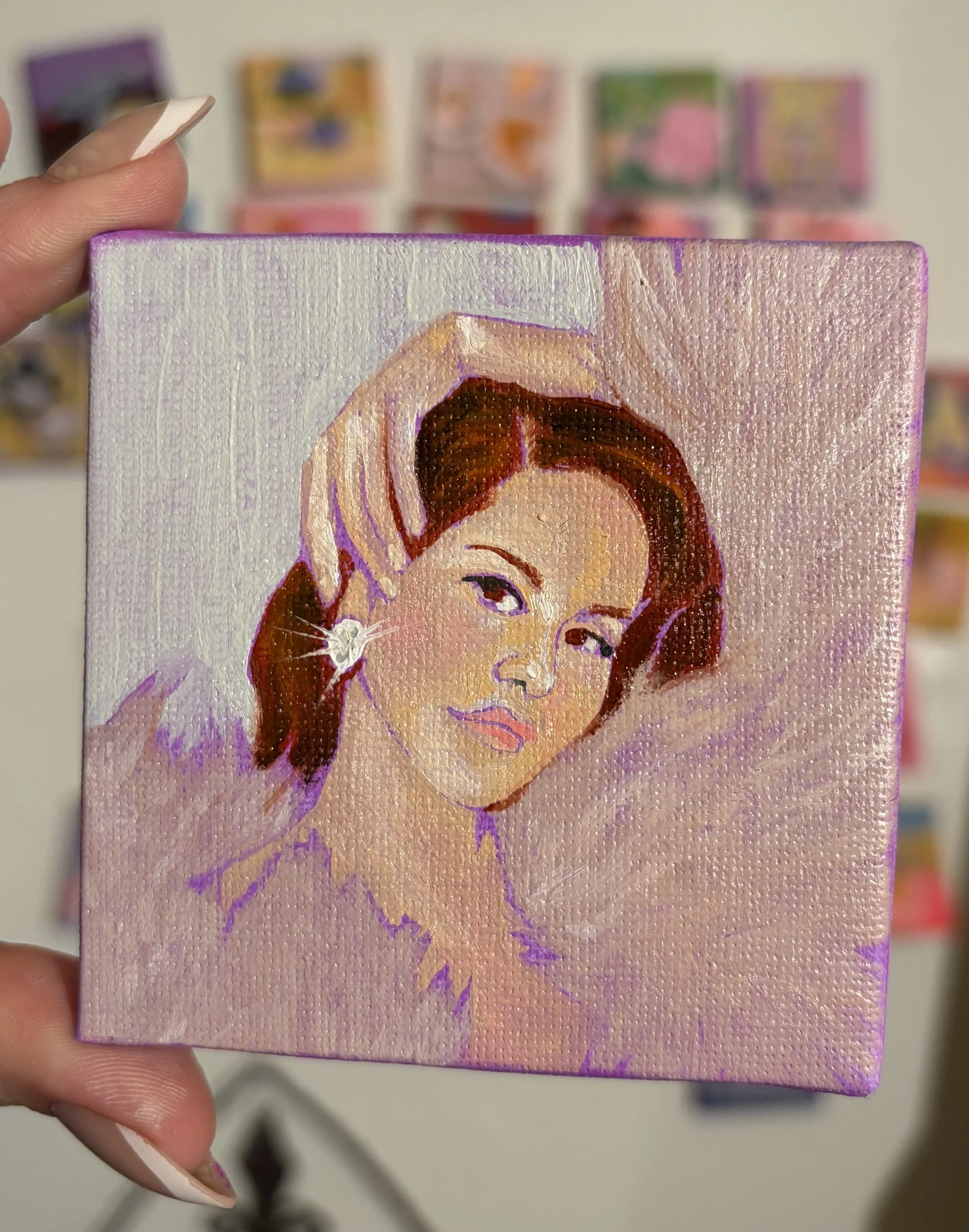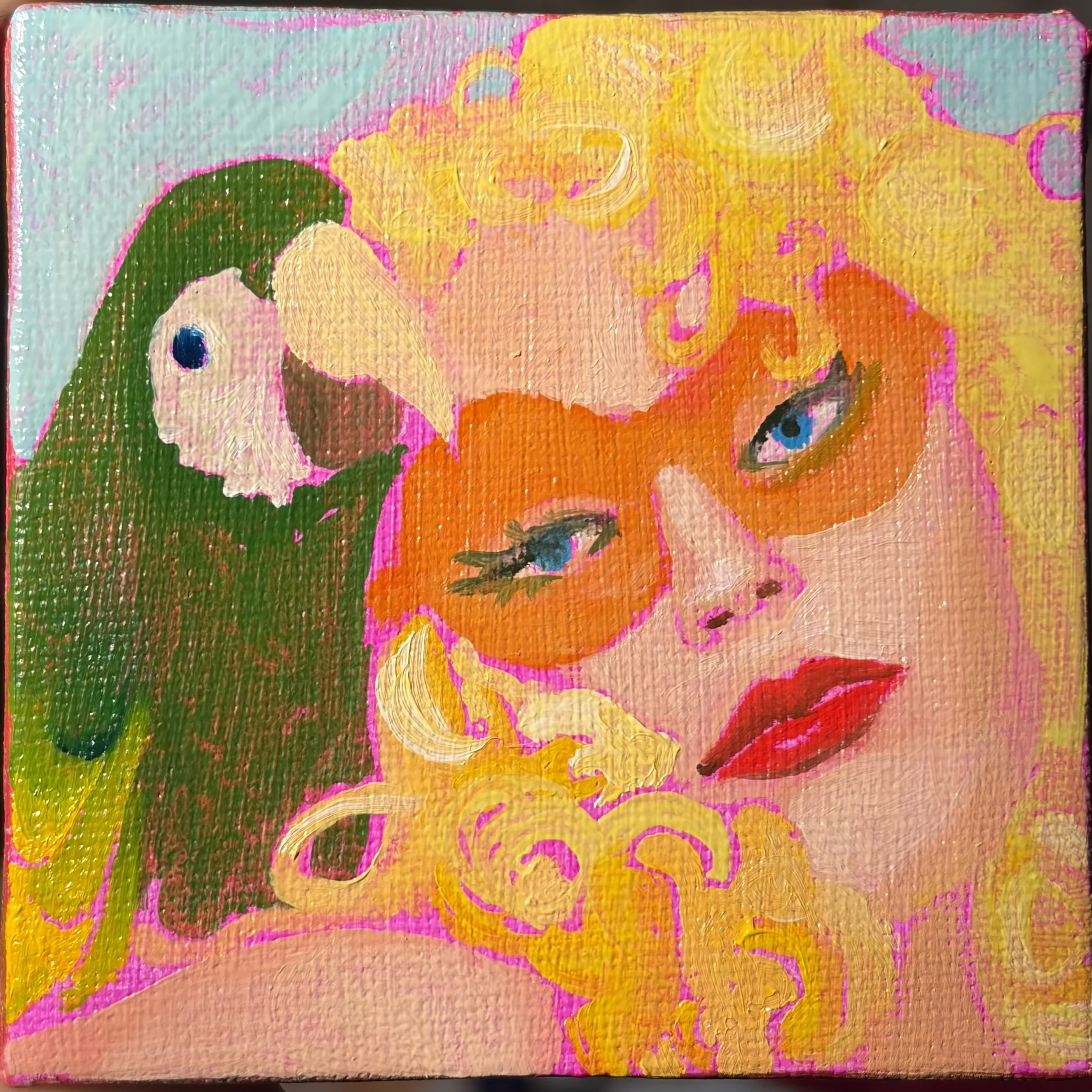3 × 3 inch original oil paintings, each one tucked into a vivid yellow cake box, functioning as both a frame and a gift. Glossy, contained, and ready to be kept, collected, or gifted from heart to heart.