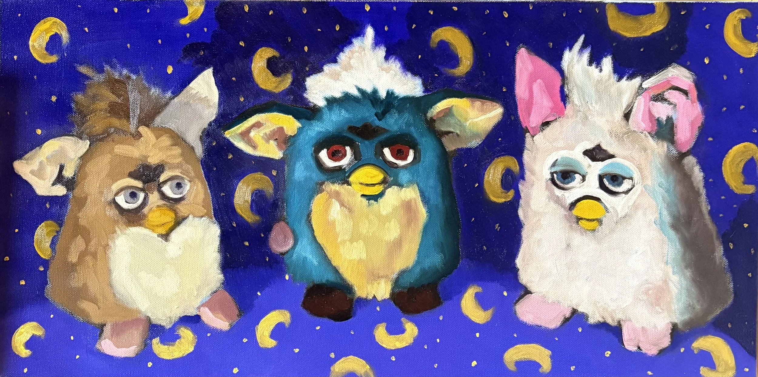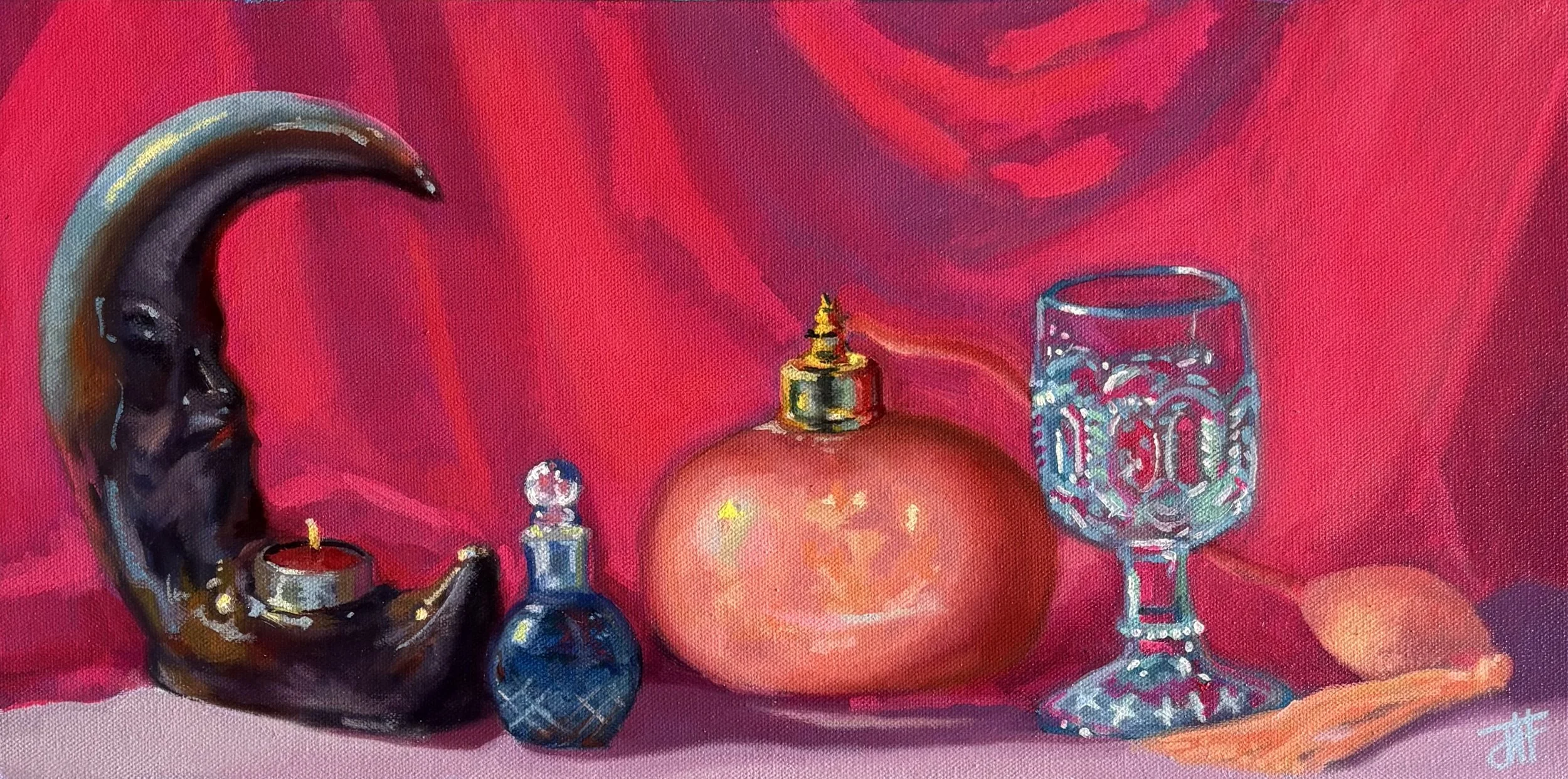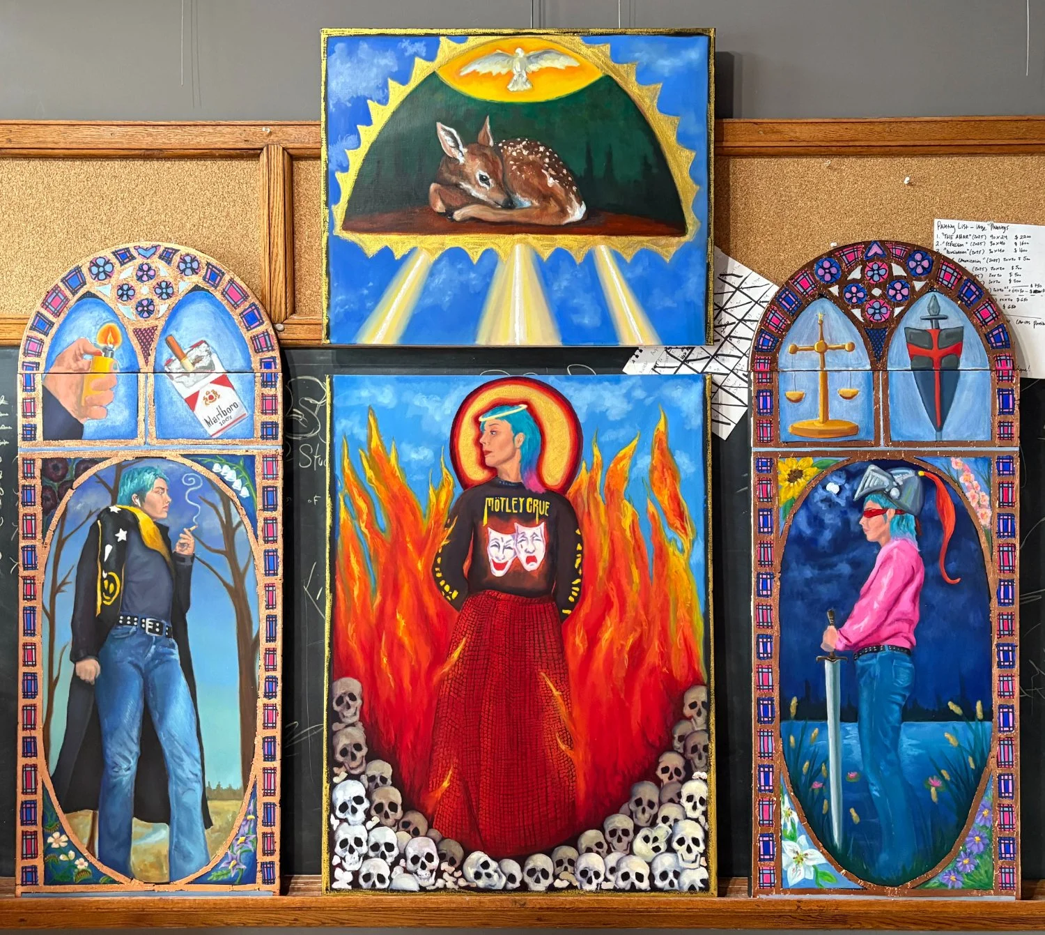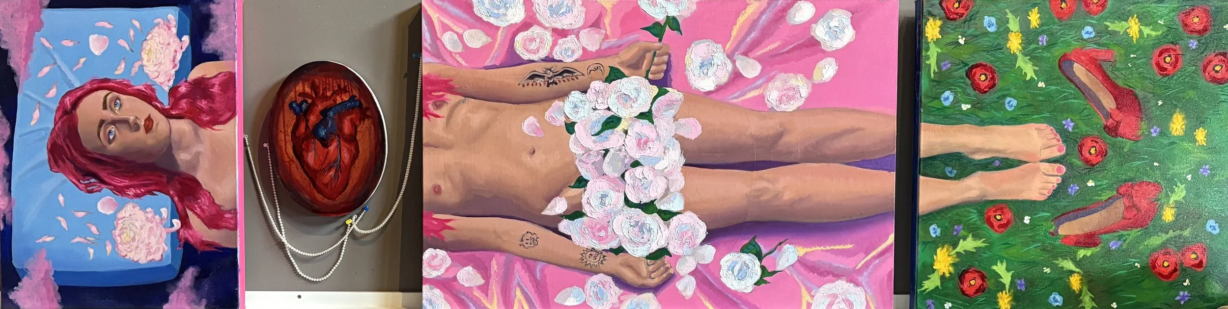 In ‘Altars we built ourselves,’ I explore the introspection and contemplation of gender often experienced by transgender and nonbinary individuals, with emphasis on these feelings and expressions not always aligning in a traditional way. With this show, I hope to give a window into my inner context to people who may not fully grasp the concept of transgender and nonbinary gender experiences, as well as a mirror to those who do. My work with both the figure and the portrait represents these freedoms in expressing oneself without the constricting ideals placed upon sex- and by using figure to subvert these gendered expectations it creates a space where people may be able to understand how unique experiences with gender can exist removed from the binary. Challenging the ideas of male and female; as well as what I like to refer to as the ‘void’ of gender expression. Exploring the relationships between sex and gender; and therefore gender and society- how upon birth we are placed into these boxes; and to challenge them is usurping the deepest and ‘first’ societal ideal we learn as human beings. Subverting them as a reference to revolutionary ideas, pushing against the binary of a wider scope of ideals. By utilizing these artistic references from Byzantine-era painting, I am fusing the identity of queer individuals into a long tapestry of symbolism. Using this as a vehicle of expression- to help center the ideas I am communicating to my audience- it unravels the deeper meaning of my work while at the same time challenging the institution of religion itself by reducing it to its most basic form.